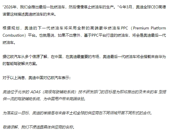 【CNMO科技消息】8月14日,CNMO了解到,据亿欧汽车报道,基于PPC平台打造的下一代奥迪A5将会成为搭载华为智能驾驶解决方案的首款车型。根据奥迪的全新命名规则,A5将会取代的是目前在售的A4。奥迪中国官方对此表示,其北京ADAS技术研发中心致力于为中国消费者提供顶尖驾驶辅助技术,正与国内外多家供应商展开广泛合作,但具体合作细节及供应商名称暂不便透露。