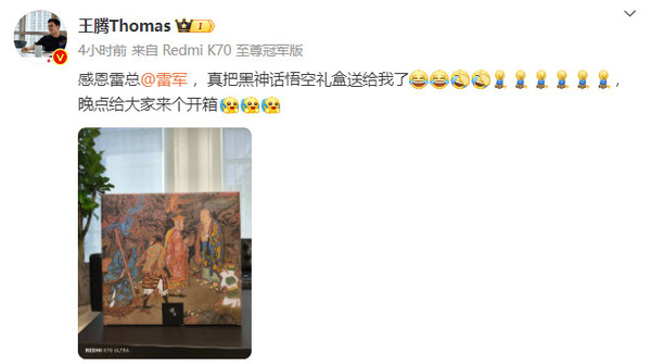 【御龙天下科技消息】日前,小米创办人、董事长兼CEO雷军在微博上晒出《黑神话:悟空》实体版,惹得不少网友羡慕。小米中国区市场部副总经理、Redmi品牌总经理王腾更是在雷军微博评论区留言称:“雷总我可以帮忙开箱”。
