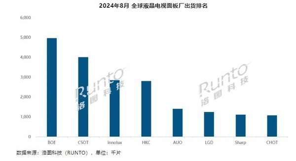 【御龙天下科技消息】9月30日,洛图科技(RUNTO)发布《全球电视面板市场出货月度追踪》,2024年8月,全球大尺寸液晶电视面板出货量为19.5M片,同比微降0.8%,环比上涨4.0%;出货面积为14.0M平方米,同比微降0.6%,环比增长3.1%。