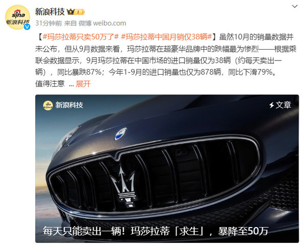【CNMO科技消息】曾经的跑车“皇后”,如今成了“妃子”。根据乘联会数据显示,9月玛莎拉蒂在中国市场的进口销量仅为38辆,同比暴跌87%;今年1-9月的进口销量也仅为878辆,同比下滑79%。与此同时,玛莎拉蒂的价格也不再高贵。以Grecale格雷嘉为例,有经销商的报价已经降至50.08万元起。