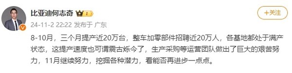 【CNMO科技消息】你以为比亚迪只是卖得多?其实它的生产速度也嗷嗷快。据CNMO了解,比亚迪执行副总裁何志奇近日发微博称,比亚迪在8-10月这三个月提产近20万台,整车加零部件招聘近20万人,各基地都处于满产状态。