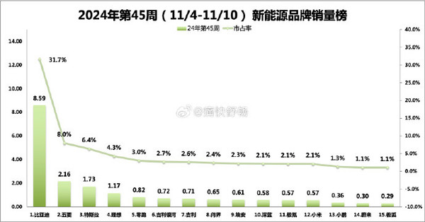【CNMO科技消息】11月13日,CNMO注意到,一位汽车博主发布了2024年第45周(11月4日至11月10日)新能源品牌销量的最新排名。数据显示,比亚迪继续以压倒性的优势领跑市场,其新能源市占率超过了排名第2至第9名品牌市占率之和。